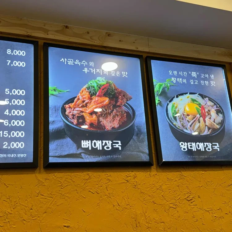 또한, 뼈해장국과 왕태해장국도 인기 메뉴인데, 뼈해장국은 8,000원, 왕태해장국은 10,000원이에요. 이 두 메뉴는 특히 술을 마신 다음 날 해장용으로 많이 찾는답니다.
