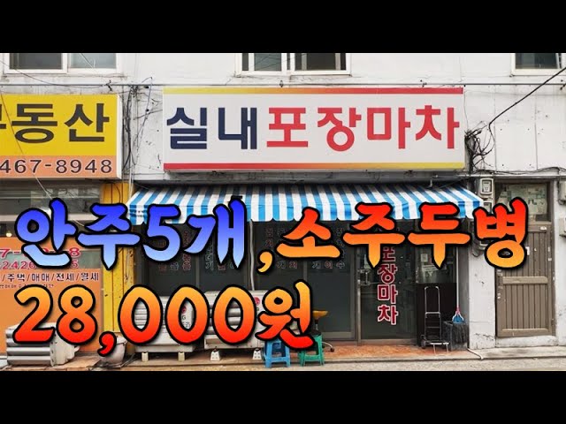 이곳의 간판은 밝고 눈에 띄어서 쉽게 찾을 수 있어요. 특히, "5 안주 + 소주 두 병"이라는 특별한 가격이 눈길을 끌더라고요.
