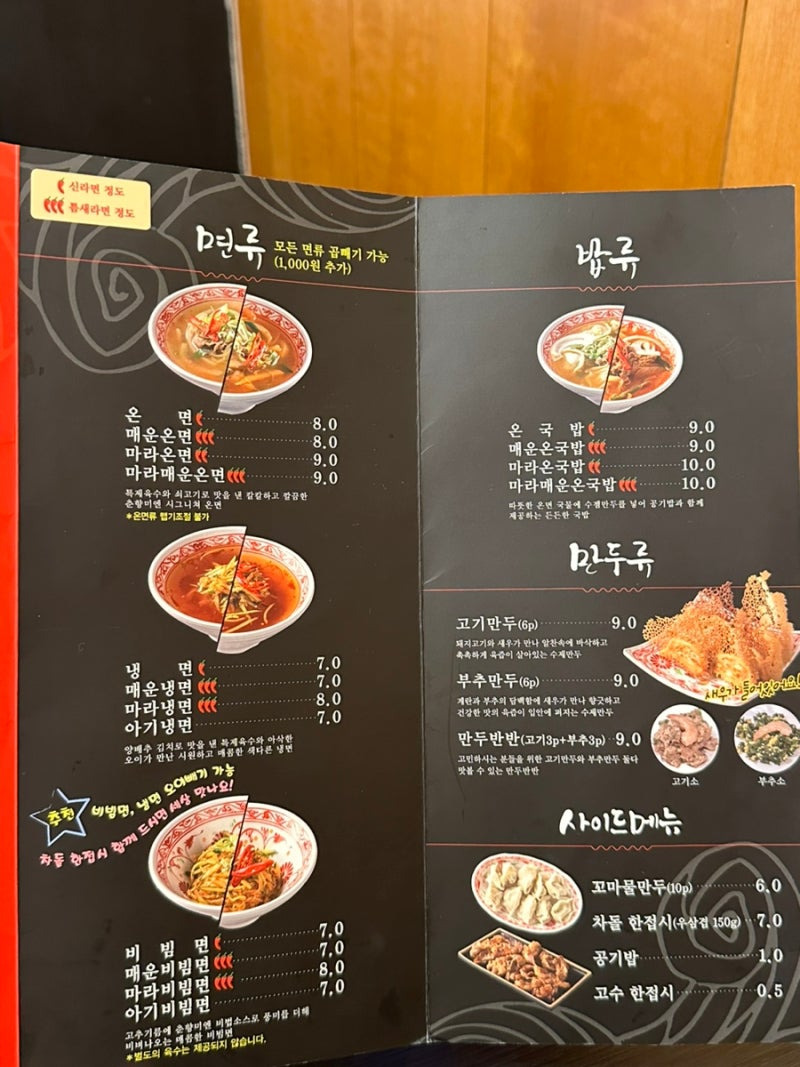 춘향미엔의 메뉴는 다양하지만, 특히 추천하고 싶은 메뉴는 매운 온면과 비빔면이에요. 매운 온면은 8,000원으로, 매운맛이 강렬하면서도 깊은 맛이 일품이에요. 비빔면은 7,000원으로, 고소한 양념과 신선한 채소가 어우러져 정말 맛있답니다.