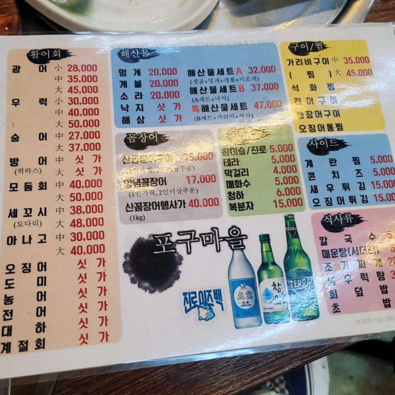 포구마을의 메뉴는 다양해요. 대표적인 메뉴로는 광어회, 우럭회, 그리고 모듬회가 있어요. 특히, 광어회는 신선한 맛이 일품이에요. 회 외에도 다양한 해산물 요리가 준비되어 있는데, 오징어회와 조개구이도 추천해요. 오징어회는 부드럽고 쫄깃한 식감이 매력적이에요.
