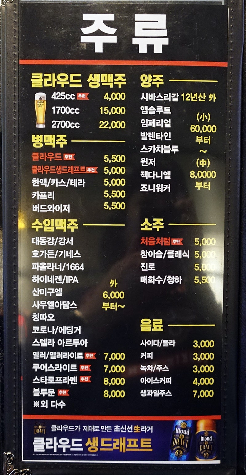 이 외에도 다양한 안주가 준비되어 있어, 친구들과 함께 나눠 먹기 좋답니다. 음료는 생맥주와 병맥주, 다양한 주류가 준비되어 있으며, 가격대는 4,000원부터 시작해요.