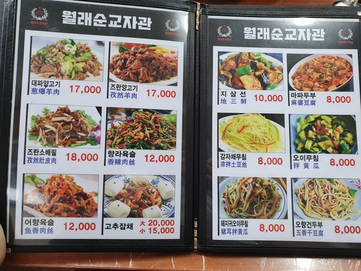 원래순교자관의 메뉴는 다양해요. 가장 인기 있는 메뉴는 군만두로, 가격은 7,000원이랍니다. 군만두는 바삭한 겉면과 촉촉한 속이 조화를 이루어 정말 맛있어요. 그 외에도 대파양고기(17,000원), 조란양고기(17,000원), 어향육슬(12,000원) 등 다양한 중식 요리를 즐길 수 있어요. 메뉴판을 보면 가격이 합리적이라는 것을 알 수 있어요.