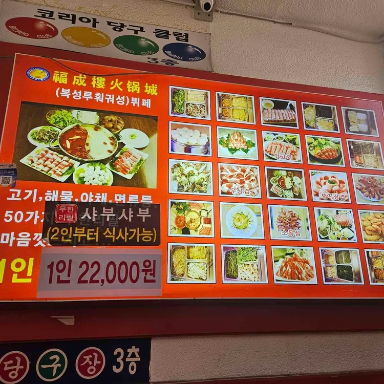 복성루샤브샤브성의 가장 큰 매력은 바로 무한리필 메뉴에요. 가격은 1인당 22,000원으로, 다양한 재료를 마음껏 즐길 수 있어요. 메뉴판에는 고기, 해산물, 채소 등 다양한 재료가 준비되어 있어 선택의 폭이 넓어요. 특히, 신선한 마블링이 있는 소고기와 다양한 해산물은 꼭 추천하고 싶어요.