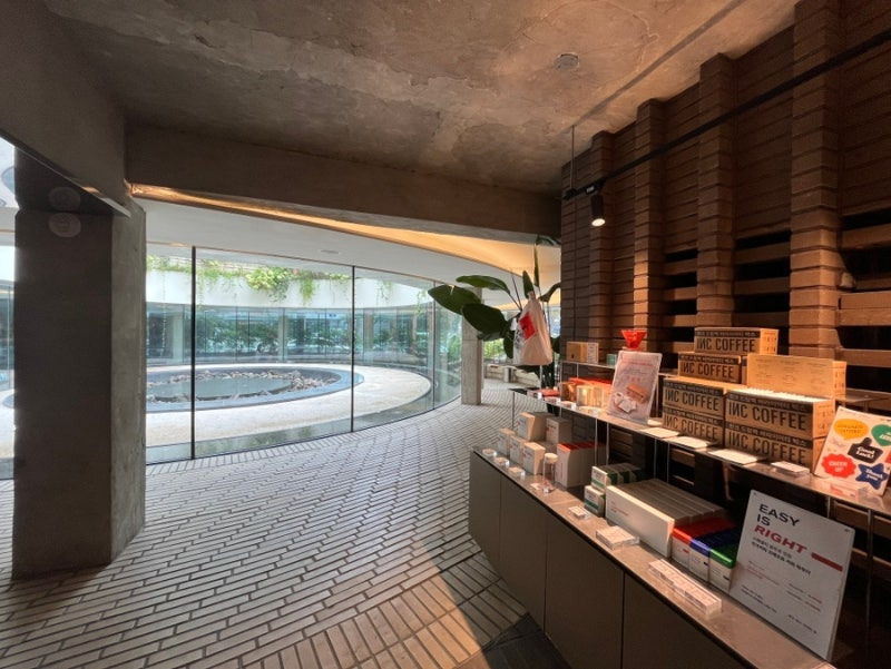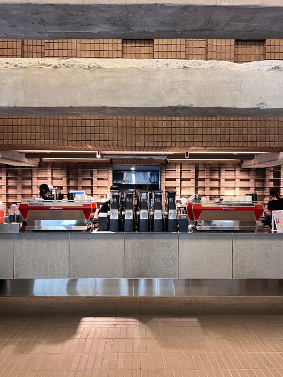 카페 내부는 현대적인 감각으로 꾸며져 있어요. 부드러운 곡선 형태의 천장과 세련된 벽돌 벽이 조화를 이루고 있답니다. 큰 유리창을 통해 자연광이 들어와서 밝고 쾌적한 분위기를 만들어줘요.
