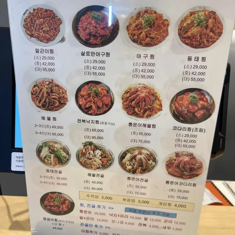 이곳의 메뉴는 해물찜을 중심으로 다양하게 구성되어 있어요. 대표 메뉴인 동태찜 외에도 알곤이찜, 살로만아구찜, 해물찜 등 여러 가지가 있어요. 가격대는 소자 29,000원부터 시작해 중자와 대자에 따라 가격이 올라가요.