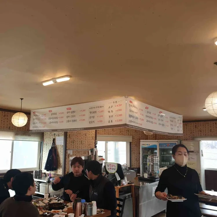 나무 테이블과 의자가 배치되어 있어 편안하게 식사할 수 있는 환경이에요. 조명이 부드럽고, 벽에는 전통적인 한국의 느낌을 살린 장식들이 있어요. 가족 단위 손님이나 친구들과 함께 오기에도 좋은 장소랍니다.