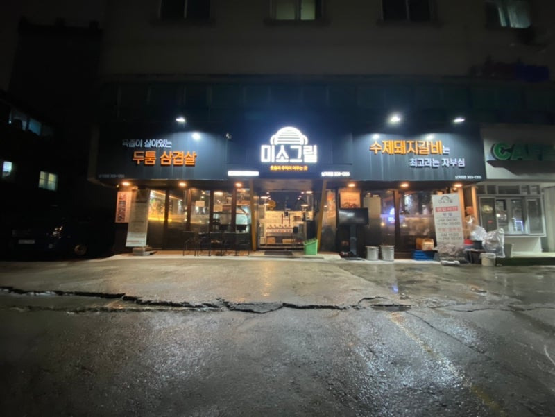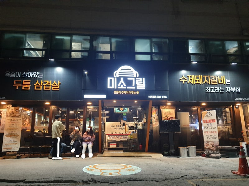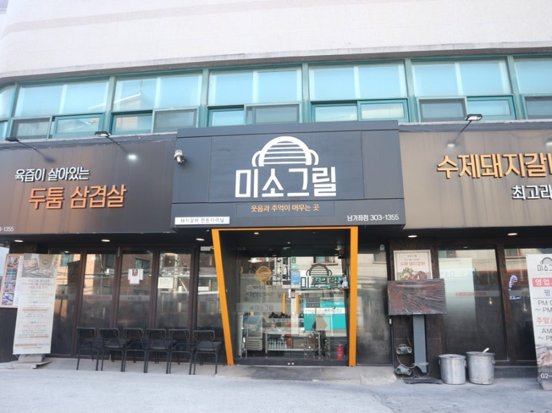 미소그릴은 남가좌동에 위치한 현대적인 고기집으로, 외관부터 세련된 느낌을 줘요.