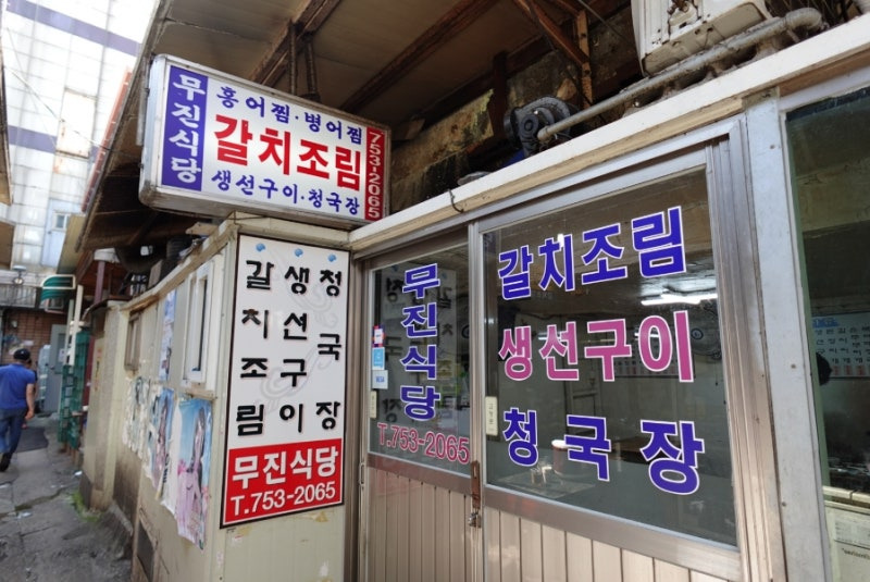 무진식당은 남대문시장 내에 위치해 있어요. 이곳은 갈치골목에 자리 잡고 있으며, 주변의 다양한 먹거리를 즐길 수 있는 곳과 가까워요. 식당의 외관은 전통적인 느낌을 주며, 간판에는 '갈치조림'과 '생선구이' 같은 메뉴가 큼지막하게 적혀 있어요.