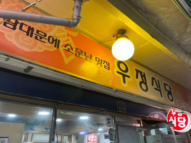 우정식당은 남대문 시장의 한복판에 위치해 있어요. 이곳은 오랜 역사를 가진 식당으로, 많은 손님들이 찾는 인기 있는 장소랍니다. 식당의 외관은 밝은 오렌지와 노란색 간판이 눈에 띄어요.