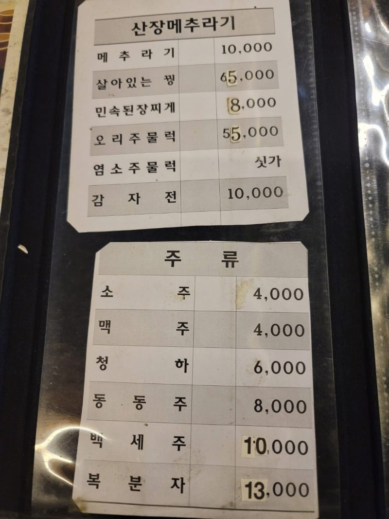 산장메추라기의 메뉴는 다양해. 특히 메추라기 요리가 유명한데, 가격은 10,000원이야. 그 외에도 살아있는 쭈는 65,000원, 민속된장찌개는 8,000원, 오리주물럭은 55,000원이야. 음료로는 소주가 4,000원, 맥주가 4,000원, 청하가 6,000원이니 참고해봐. 개인적으로는 메추라기와 민속된장찌개 조합이 정말 맛있었어!