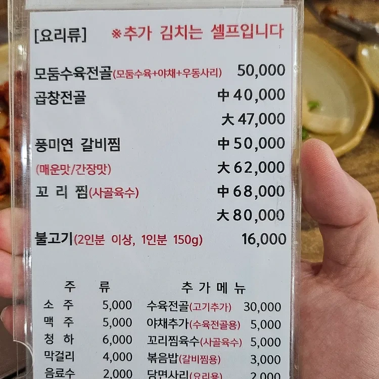 그 외에도 '모듬수육전골'과 '곰창전골'도 인기 메뉴로, 각각 50,000원과 40,000~47,000원이에요. 음료로는 소주와 맥주가 5,000원에 제공되니, 식사와 함께 즐기기 좋겠죠?