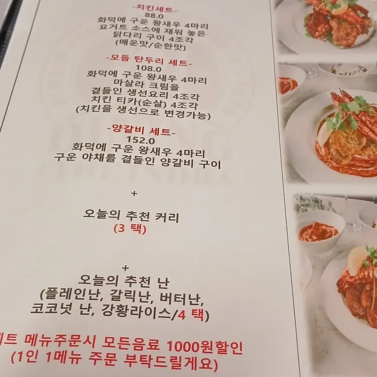 이곳의 추천 메뉴는 여러 가지가 있지만, 특히 '모둠 탄두리 세트'와 '커리'가 인기예요. 모둠 탄두리 세트는 다양한 고기와 채소가 포함되어 있어 여러 가지 맛을 즐길 수 있어요. 가격은 54,000원 정도로, 두 사람이 나눠 먹기에 적당해요.