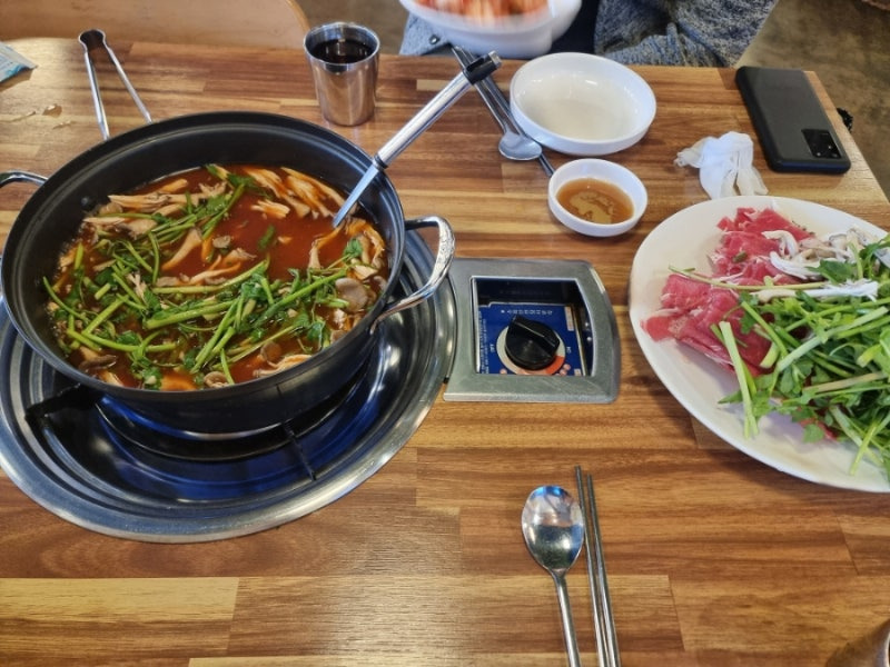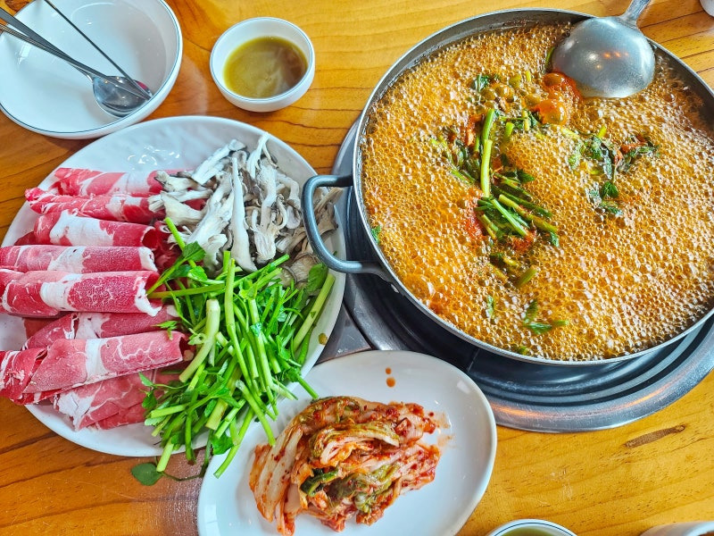 이곳의 주 메뉴는 샤브샤브와 칼국수인데요, 가격은 인당 약 12,000원 정도로 가성비가 정말 뛰어나요. 특히, 샤브샤브와 함께 나오는 칼국수는 직접 뽑은 면이라서 쫄깃한 식감이 일품이에요.