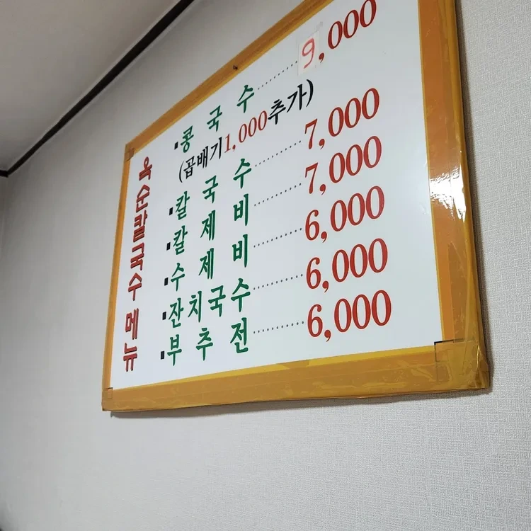 옥순손칼국수의 가격은 매우 합리적이에요. 칼국수는 7,000원, 콩국수는 9,000원, 부추전은 6,000원으로, 다양한 메뉴를 저렴한 가격에 즐길 수 있어요. 메뉴판은 간단하고 보기 쉽게 정리되어 있어요.