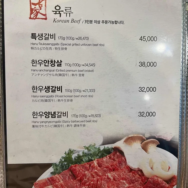 이 메뉴판에는 특별한 생갈비, 프리미엄 갈비살, 매운 양념갈비 등 다양한 옵션이 있어요. 각 메뉴의 가격과 중량이 명시되어 있어 선택하기도 쉬워요.