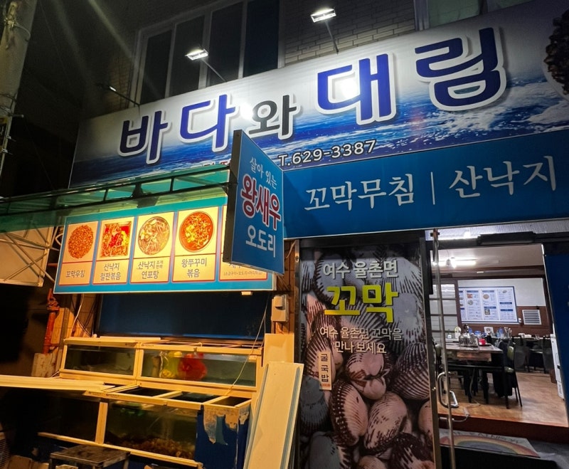 '바다와 대림'은 대구의 남구에 위치해 있어요. 외관은 바다를 테마로 한 푸른 색감의 간판이 인상적이에요. 입구에는 조개 장식이 있어 해산물 전문점이라는 느낌을 주고, 메뉴판에는 다양한 해산물 요리가 소개되어 있어요. 특히 왕새우와 같은 특별한 메뉴가 눈에 띄네요.