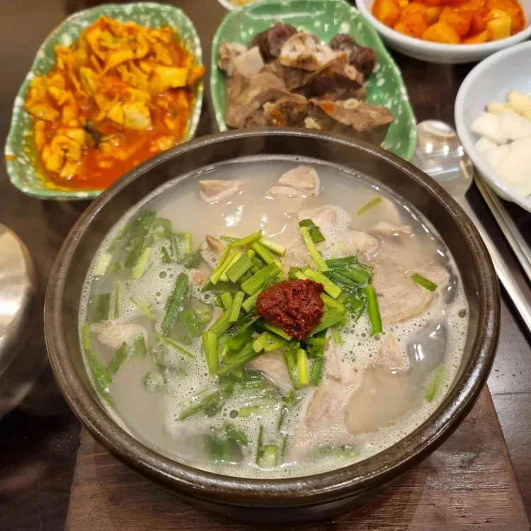 미성돼지국밥의 대표 메뉴는 바로 돼지국밥이에요. 기본적으로 제공되는 국밥은 고기와 국물의 조화가 뛰어나고, 가격은 8,000원 정도로 매우 합리적이에요. 추가로 다양한 반찬이 제공되는데, 특히 다진 마늘과 김치가 국밥과 잘 어울려요.