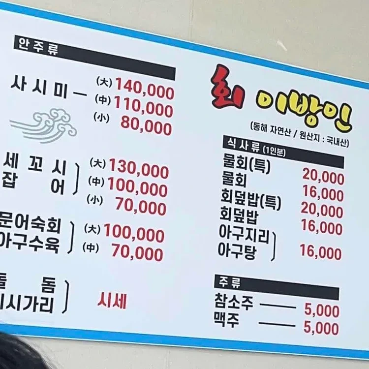 이방인횟집의 메뉴는 다양해요. 특히 신선한 해산물로 만든 사시미가 유명한데요, 가격대는 5,000원부터 140,000원까지 다양해요.