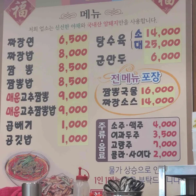 차차반점의 메뉴는 다양하지만, 특히 추천하고 싶은 메뉴는 짬뽕과 짜장면이에요. 짬뽕은 매운고추짬뽕이 유명하고, 짜장면은 깊고 진한 맛이 일품이에요. 가격은 짜장면이 6,500원, 짜장밥이 8,000원, 군만두가 6,000원이에요. 매운고추짬뽕은 9,000원으로, 매운 음식을 좋아하는 분들에게 강력 추천해요.