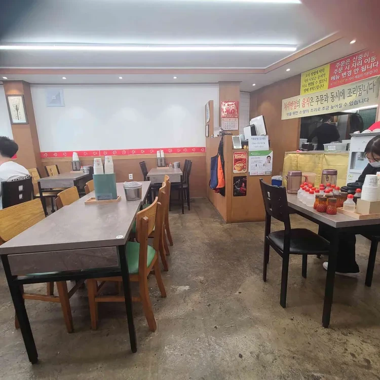 식당 내부는 아늑하고 편안한 분위기로 꾸며져 있어요. 나무 테이블과 의자가 배치되어 있어, 가족이나 친구들과 함께 오기 좋은 공간이에요. 벽에는 한국적인 느낌의 장식이 있어, 전통적인 분위기를 느낄 수 있어요.