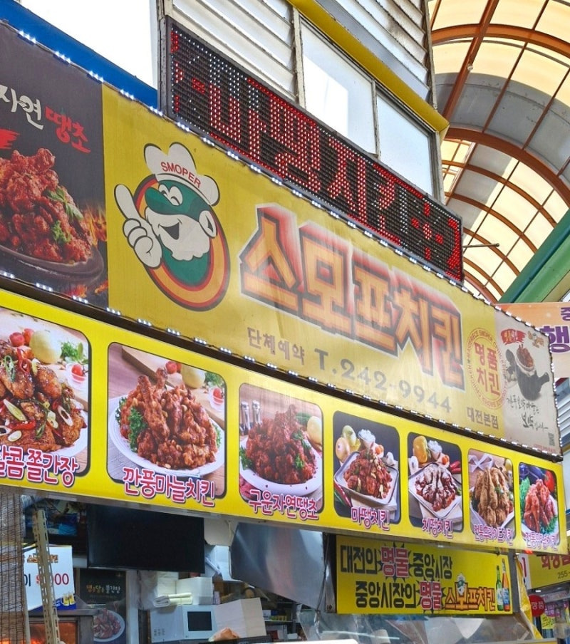 스모프치킨은 대전 중앙시장에 위치해 있어요. 이곳은 다양한 먹거리가 가득한 시장 안에 있어서, 치킨을 먹기 전에 다른 맛있는 음식들도 함께 즐길 수 있는 장점이 있답니다.
