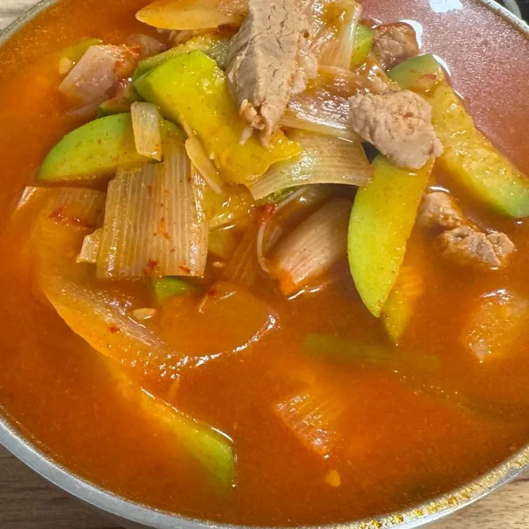 애국집의 대표 메뉴는 애호박국밥이에요. 이 국밥은 애호박과 돼지고기가 듬뿍 들어가 있어 국물의 깊은 맛을 느낄 수 있어요. 국물은 얼큰하면서도 부드러운 맛이 특징이에요. 가격은 8,000원으로, 양도 푸짐해요.