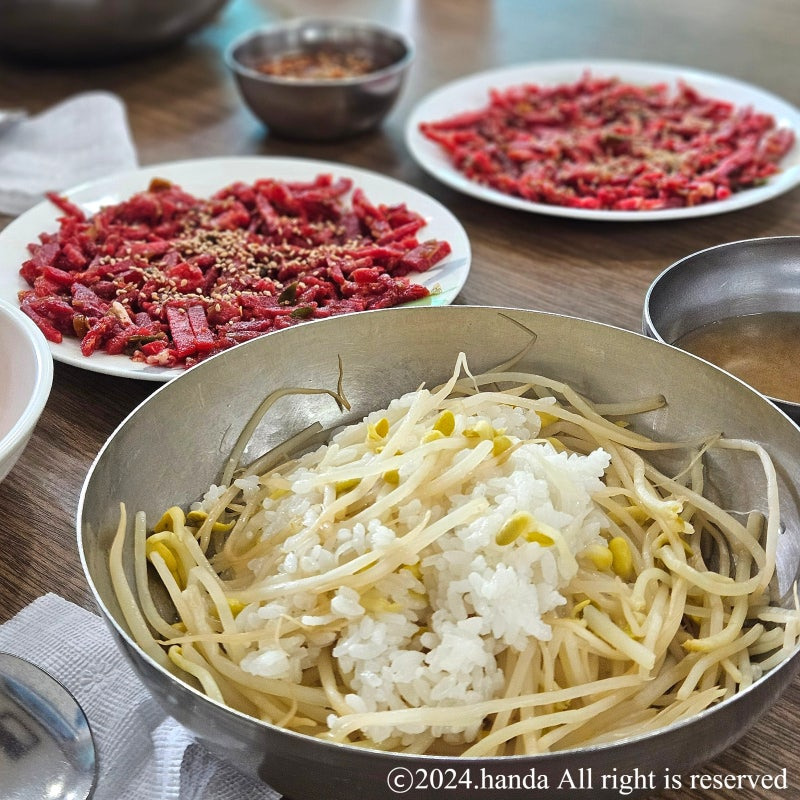 특히, 육회는 고기가 신선하고 부드러워서 한 번 먹어보면 계속 생각나는 맛이에요. 그리고 콩나물밥과 함께 나오는 된장국도 정말 맛있답니다.