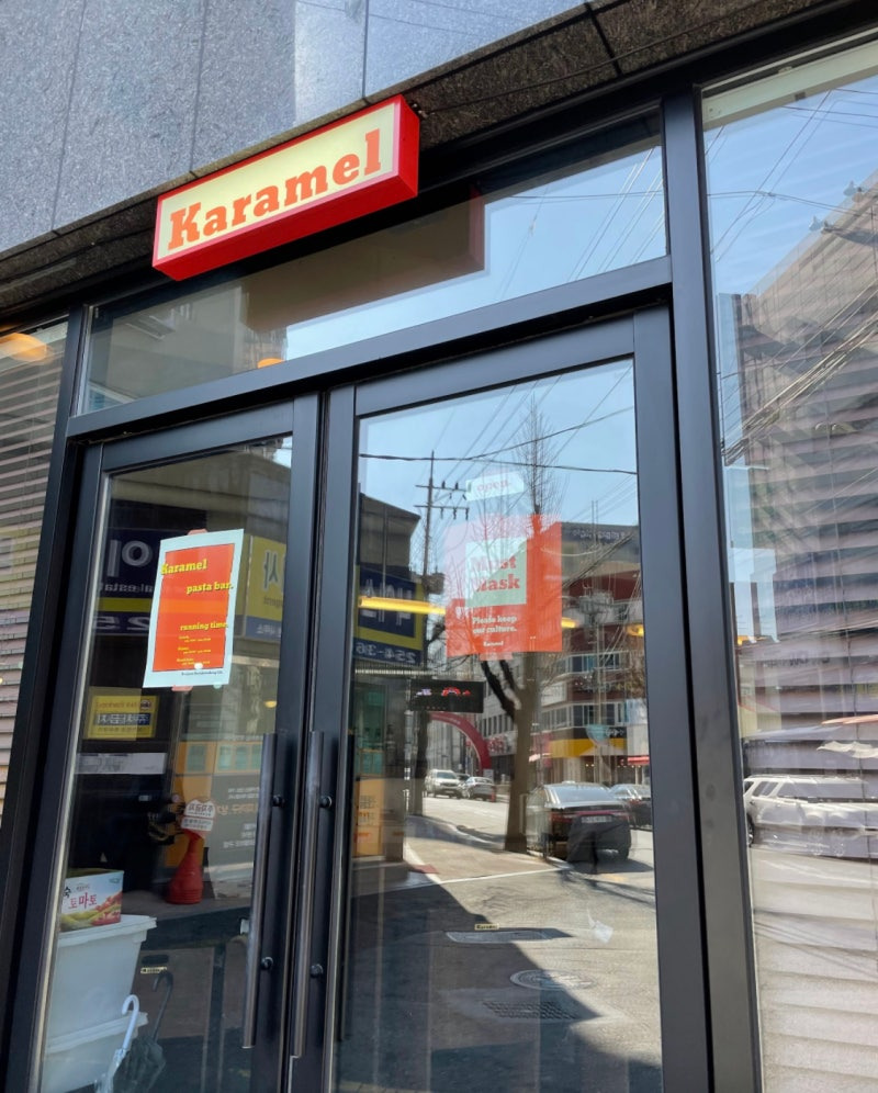 카라멜은 대전 은행동에 위치해 있어요. 외관은 현대적이고 세련된 느낌을 주며, 입구에는 밝은 색상의 간판이 눈에 띄어요.