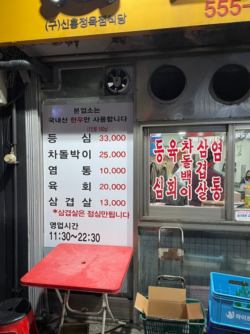신흥식당의 메뉴는 정말 다양해요. 특히 추천하고 싶은 메뉴는 '등심'과 '차돌박이'예요. 등심은 33,000원, 차돌박이는 25,000원으로 가격도 합리적이에요. 이 외에도 '염통' 10,000원, '육회' 20,000원, '삼겹살' 13,000원 등 다양한 선택지가 있어요.