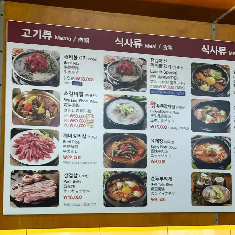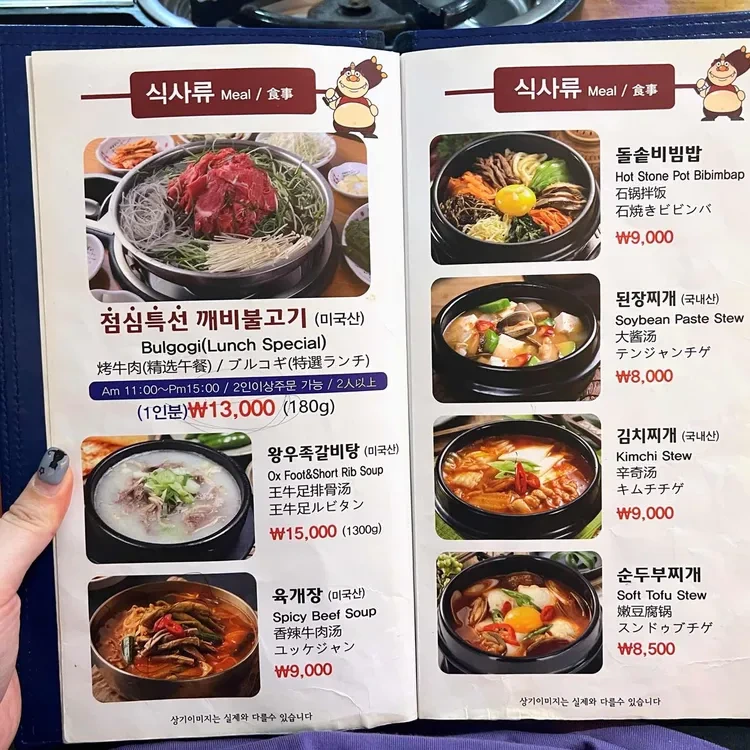 이곳의 메뉴는 다양하고 가격도 합리적이에요. 특히 추천하고 싶은 메뉴는 불고기와 함께 나오는 다양한 반찬들이에요.