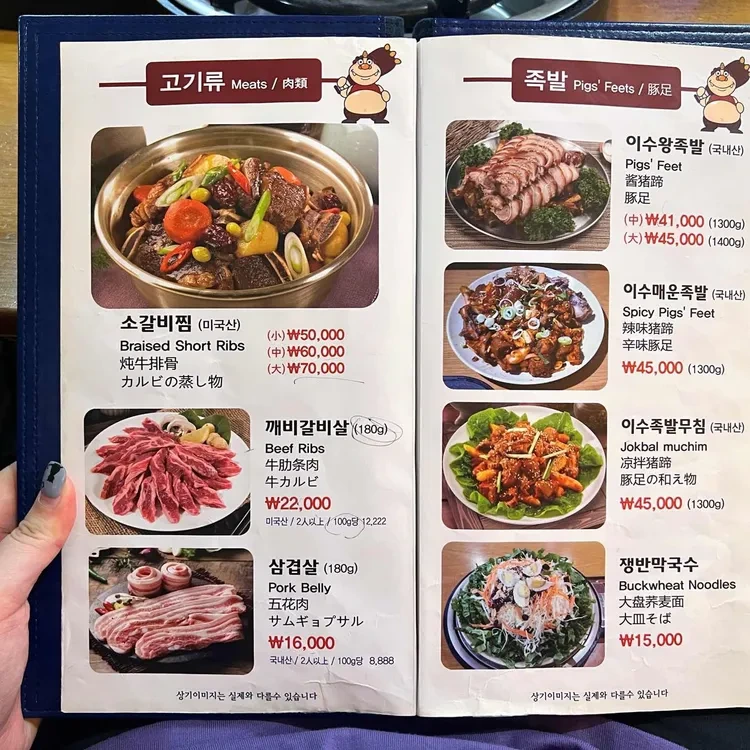 메뉴판을 보면, 소불고기, 돼지고기, 그리고 다양한 찌개류까지 있어요. 가격대는 소불고기가 약 22,000원, 돼지고기는 16,000원 정도로, 가성비가 뛰어나답니다.