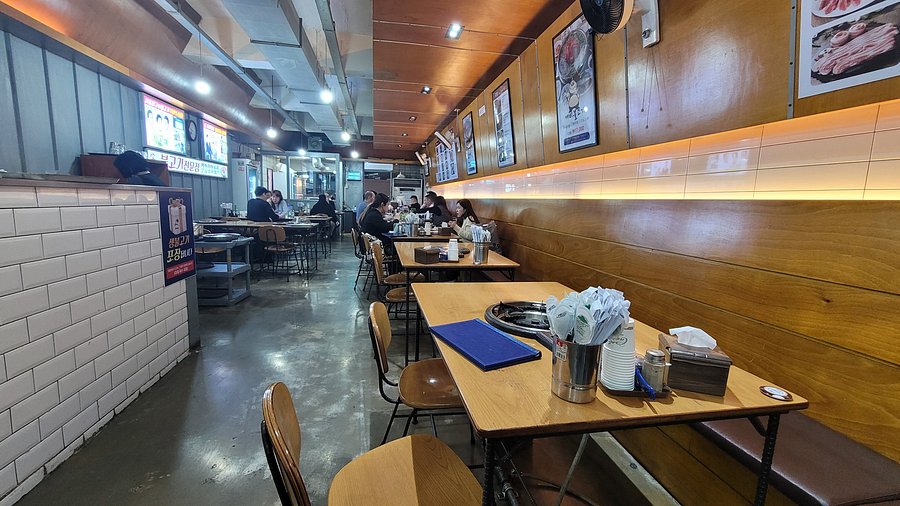 나무 패널과 깔끔한 바닥이 조화를 이루고, 테이블 간격도 적당해 편안하게 식사할 수 있어요. 밝은 조명 아래에서 맛있는 음식을 즐기니 기분이 정말 좋았답니다.