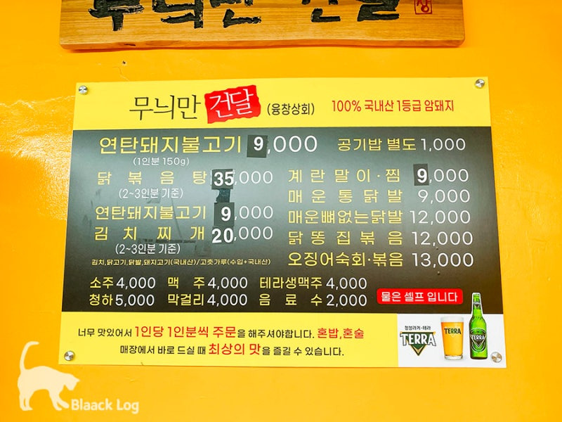 이곳의 추천 메뉴는 연탄돼지불고기입니다. 가격은 9,000원으로, 양도 푸짐하고 맛도 뛰어나요. 그 외에도 계란말이(9,000원), 김치찌개(20,000원) 등 다양한 메뉴가 준비되어 있어요. 특히, 매운닭발과 같은 사이드 메뉴도 인기랍니다.