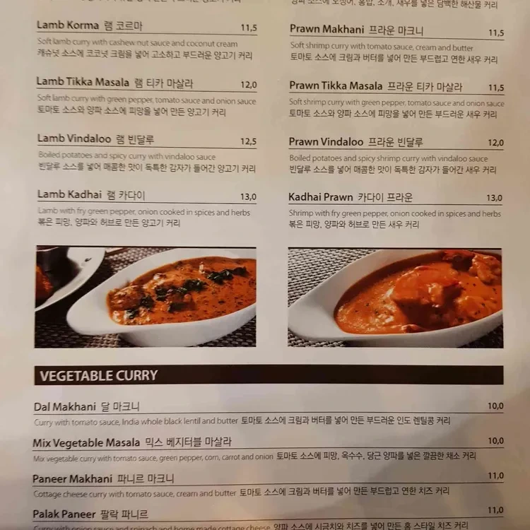 커리야의 메뉴는 정말 다양해요. 대표적인 메뉴로는 양고기 커리인 '람 코르마', 새우 커리인 '프론 마카니', 그리고 '람 티카 마살라'가 있어요. 가격대는 10,000원에서 13,000원 사이로, 가성비가 뛰어난 편이에요. 특히, 커리와 밥은 무한 리필이 가능하다는 점이 매력적이에요. 리필할 때마다 다른 맛의 커리를 제공해주기 때문에 여러 가지 맛을 즐길 수 있답니다.
