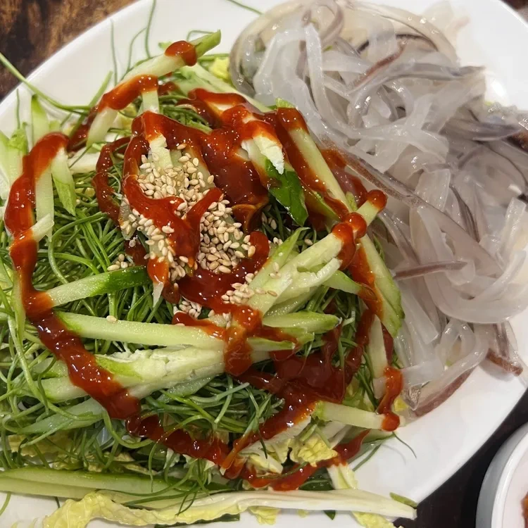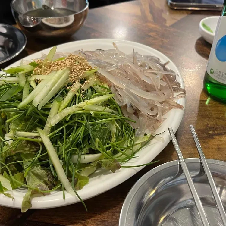 이곳의 추천 메뉴는 단연코 '산오징어 회'와 '산오징어 찜'이에요. 산오징어 회는 신선한 오징어와 함께 오이, 양파, 배추, 깻잎 등의 채소가 넉넉하게 올려져 나와요. 가격은 약 25,000원 정도로, 신선한 재료를 고려하면 합리적인 가격이에요.