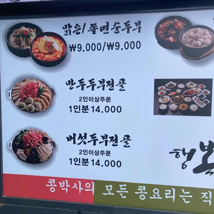 메뉴판을 보면 다양한 두부 요리와 함께 여러 가지 반찬도 함께 제공되니, 한 끼 식사로 충분히 만족할 수 있어요. 개인적으로 추천하는 메뉴는 콩국수와 두부전골이에요. 두부전골은 신선한 재료가 가득 들어가서 정말 맛있답니다.