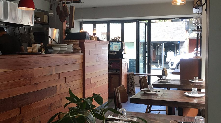 식당 내부는 아늑하고 따뜻한 분위기로 꾸며져 있어요. 나무 패널과 테이블이 조화를 이루며, 자연광이 들어오는 큰 창문이 있어요.