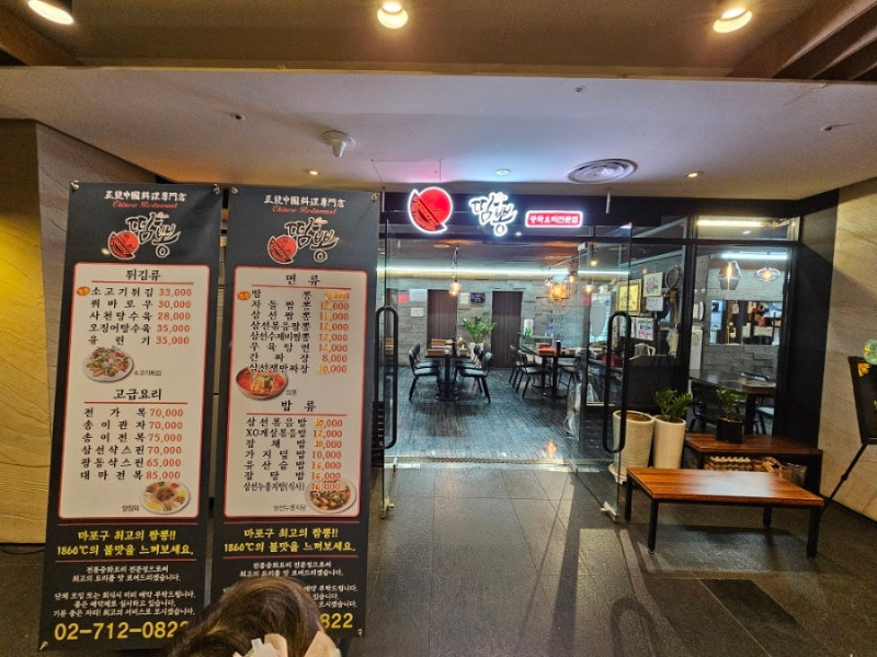 땀뽕은 마포구에 위치한 짬뽕 전문점으로, 접근성이 좋은 위치에 자리 잡고 있어요. 지하철역에서 도보로 몇 분 거리에 위치해 있어 쉽게 찾아갈 수 있답니다. 식당의 외관은 현대적이고 깔끔한 느낌을 주며, 입구에는 메뉴와 가격이 적힌 큰 배너가 있어요.