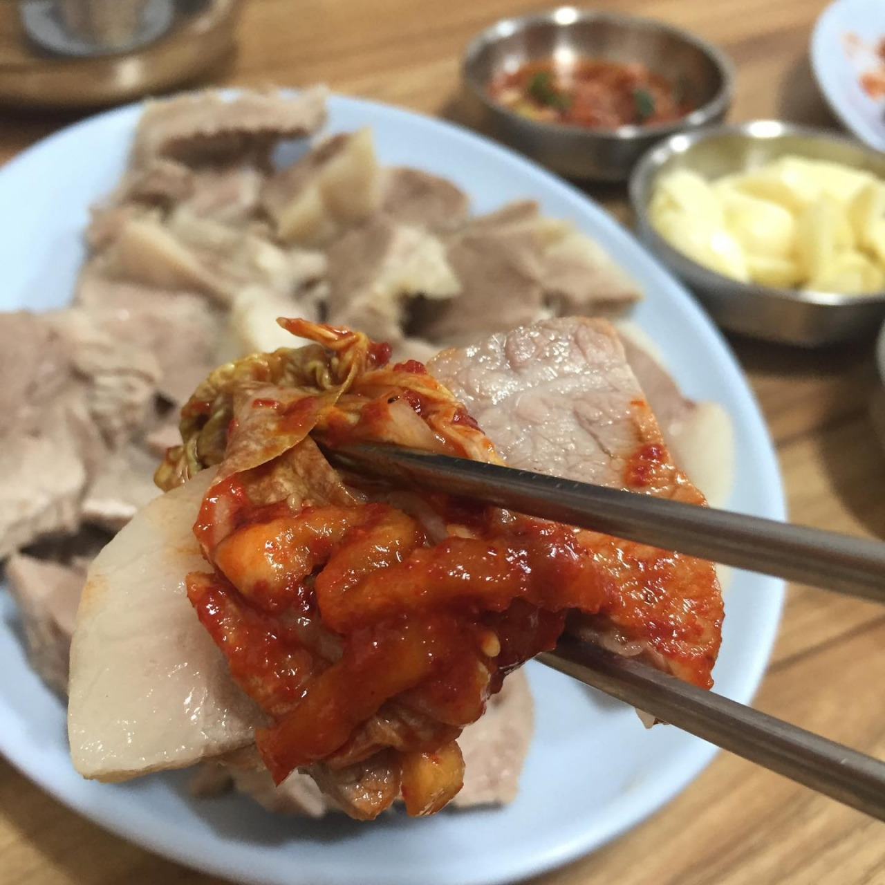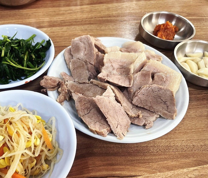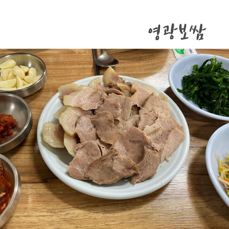 영광보썸의 대표 메뉴는 당연히 보쌈이에요. 이곳의 보쌈은 부드러운 고기와 함께 신선한 김치가 곁들여져 나와요. 특히, 보쌈과 함께 나오는 다양한 사이드 메뉴도 인상적이에요. 부추무침, 콩나물무침, 그리고 마늘과 매운 소스가 함께 제공되는데, 이 조합이 정말 맛있답니다.