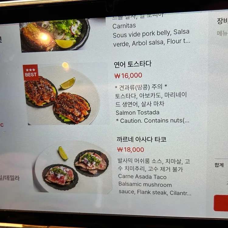 또한, 익스첼의 시그니처 메뉴인 'Salmon Tostada'는 ₩16,000으로, 신선한 연어와 아보카도가 조화를 이루는 맛이 일품이에요. 그리고 'Carne Asada Taco'는 ₩18,000으로, 부드러운 플랭크 스테이크와 발사믹 버섯 소스가 어우러져 정말 맛있답니다.
