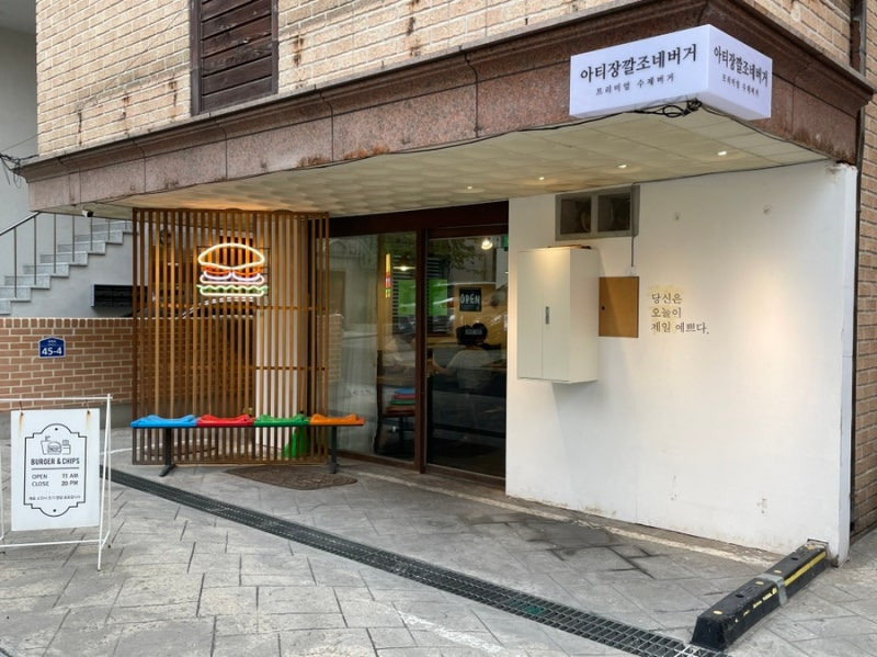 아티장 깔조네버거는 서울 마포구 상수동에 위치해 있어요. 이곳은 깔조네를 버거 번 대신 사용한 독특한 퓨전 버거를 제공하는 곳으로, 수제버거의 새로운 매력을 느낄 수 있는 곳이에요. 외관은 현대적인 디자인으로, 나무 슬랫과 벽돌이 조화를 이루고 있어요. 입구에는 화려한 네온사인과 함께 메뉴가 적힌 화이트 간판이 있어요.