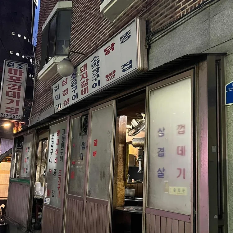 원조마포껍데기집은 마포구 공덕동에 위치해 있어요. 이곳은 전통적인 한국식 바비큐를 즐길 수 있는 곳으로, 외관은 벽돌로 되어 있어 아늑한 느낌을 주고 있어요.