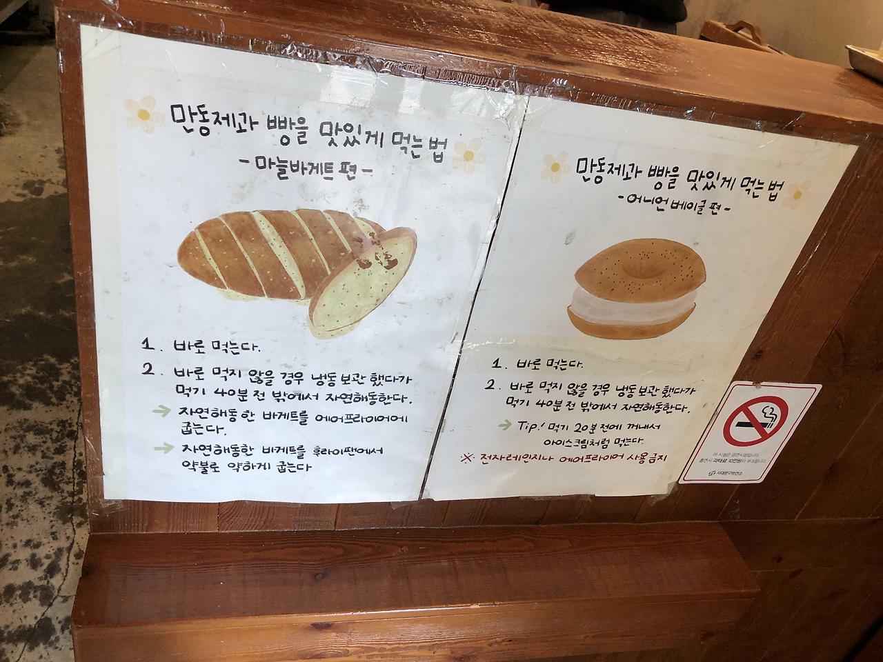 또한, 이곳의 빵은 신선하게 만들어져서 바로 먹는 것이 가장 맛있어요. 그래서 "1. 바로 먹기"와 "2. 40분 후에 먹기"라는 두 가지 방법이 안내되어 있어요.