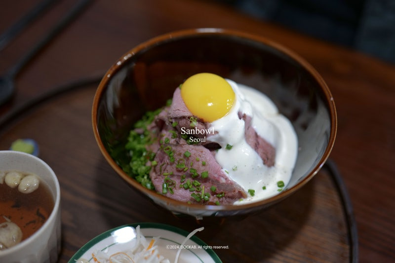 산볼의 대표 메뉴는 로스트 비프 덮밥이에요. 고기가 부드럽고, 위에 얹어진 생계란 노른자가 정말 맛있어요. 가격은 대략 12,000원에서 15,000원 사이로, 가성비도 뛰어나요.