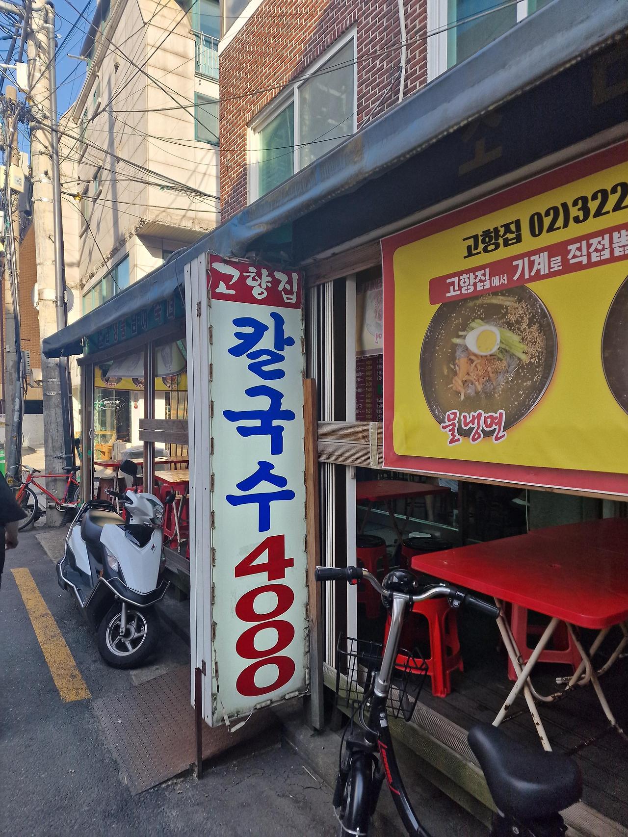 식당의 간판에는 '칼국수 4,000원'이라는 문구가 크게 적혀 있어, 가격이 저렴하다는 것을 한눈에 알 수 있어요. 주변에는 자전거와 스쿠터가 주차되어 있어, 지역 주민들이 자주 찾는 곳이라는 느낌을 줘요.