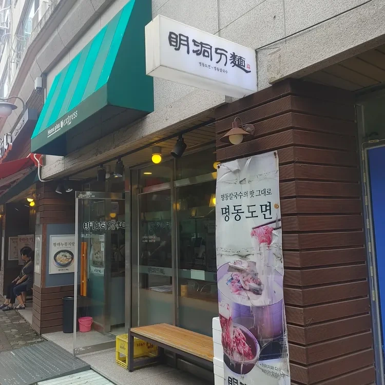 입구에는 '명동도면'이라는 간판이 걸려 있고, 그 옆에는 맛있는 음식을 홍보하는 배너가 있어요. 이곳은 항상 많은 손님들로 붐비는 인기 있는 장소랍니다.
