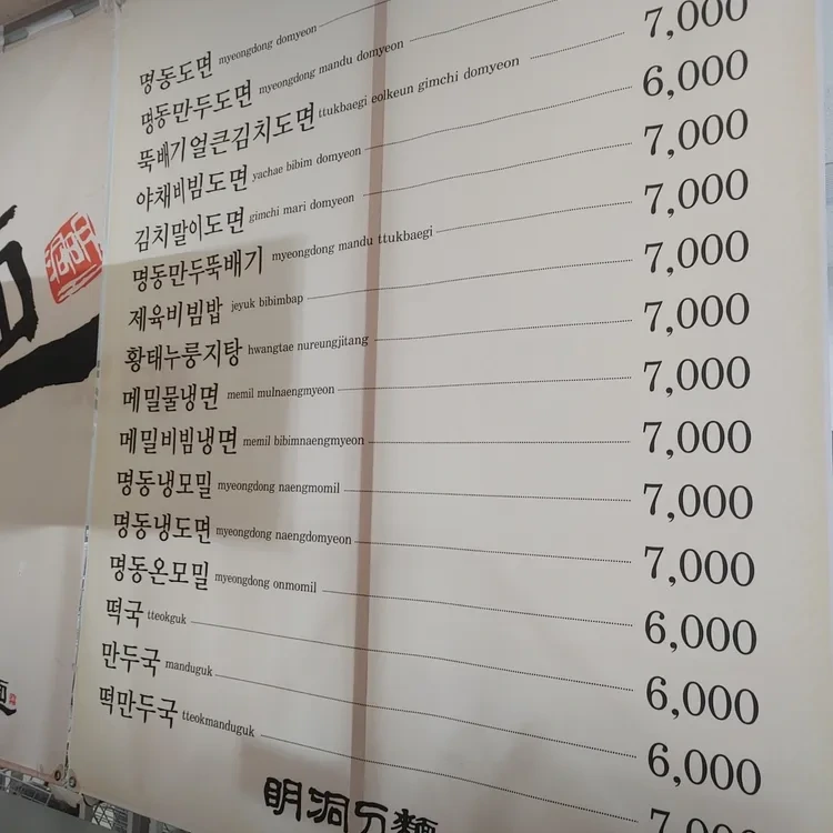 명동도면의 메뉴는 다양해요. 주로 칼국수와 비빔국수, 그리고 만두가 인기인데요. 기본 메뉴인 '명동도면'은 6,000원으로 저렴한 편이에요. 가장 비싼 메뉴는 7,000원으로, 가격대가 매우 합리적이죠.