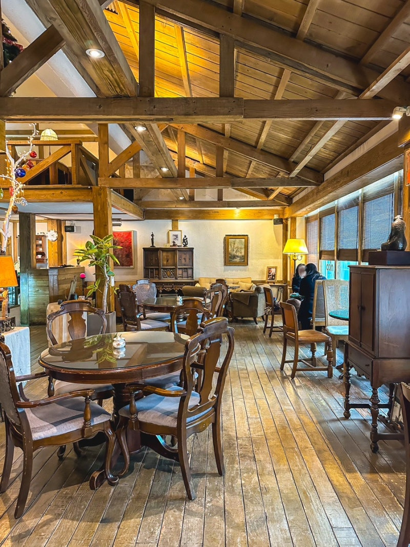카페 내부는 rustic한 매력이 가득해요. 나무로 된 기둥과 높은 천장이 조화를 이루며, 여러 개의 원형 나무 테이블과 우아한 의자들이 배치되어 있어요. 자연광이 큰 창문을 통해 들어와 따뜻한 느낌을 주고, 식물과 예술 작품들이 공간에 개성을 더해주고 있답니다.