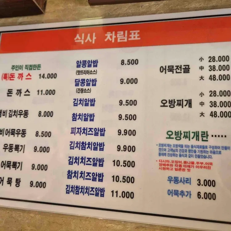 메뉴판에는 오방찌개와 일식돈까스 같은 다양한 메뉴가 소개되어 있어요.