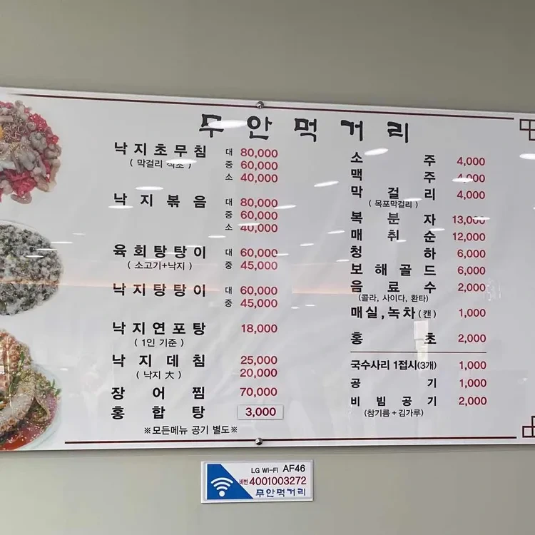 무안먹거리의 추천 메뉴는 여러 가지가 있지만, 특히 '낙지초무침'과 '낙지볶음'이 유명해요. 낙지초무침은 매콤한 양념과 함께 신선한 채소가 어우러져 정말 맛있답니다. 가격은 대짜가 80,000원, 중짜가 60,000원이에요. 낙지볶음도 비슷한 가격대인데, 매콤한 소스와 함께 볶아져 나와서 밥과 함께 먹으면 정말 맛있어요.